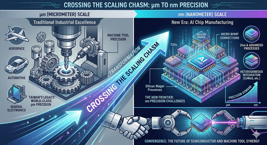 長期以來,台灣的工具母機產業以卓越的微米級(μm)加工精度聞名全球,支撐了航太、汽車與一般電子業的繁榮。然而,當 AI 晶片進入 2 奈米甚至更先進的製程,並結合異質整合封裝技術時,傳統機械加工的精度邊界受到了嚴峻挑戰。