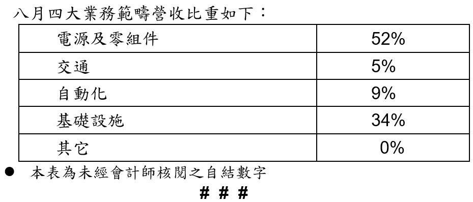 台达电子工业股份有限公司今(8)日公布114年8月份合并营业额为新台币478.60亿元,较113年同期合并营业额新台币377.70亿元成长26.7%,较上月份合并营业额新台币453.97亿元成长5.4%;114年1~8月份累积合并营业额为新台币3,362.11亿元,较113年同期累积合并营业额新台币2,698.51亿元成长24.6%。
