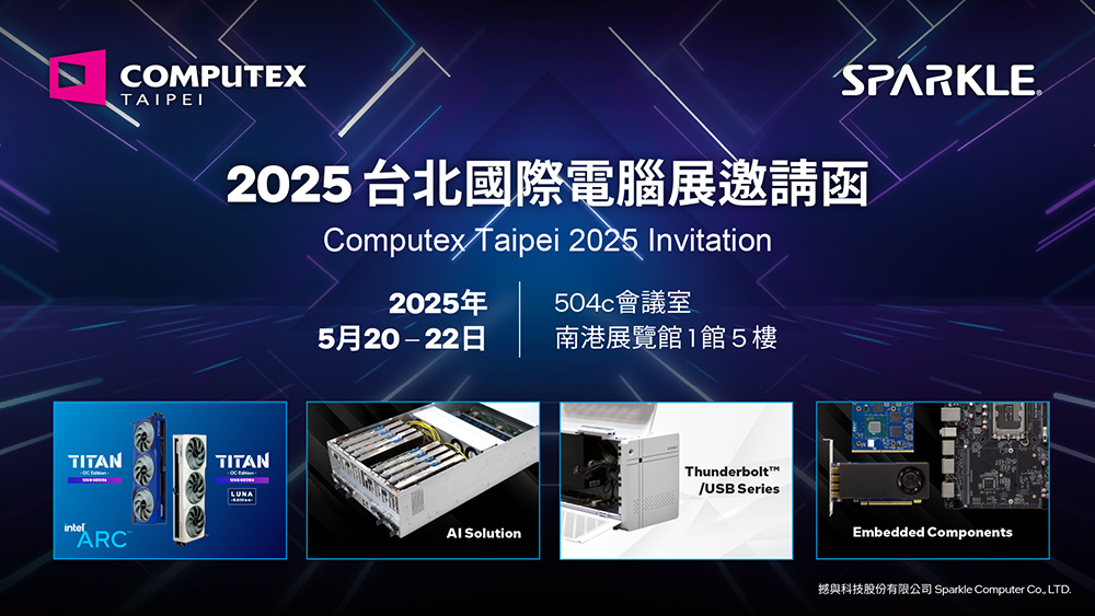 顯示卡領導廠商撼訊科技旗下子公司——撼與科技(SPARKLE),將於 2025 台北國際電腦展(COMPUTEX 2025)盛大登場,匯聚四大主題展區,完整呈現其針對 AI 新世代的技術實力與市場佈局。