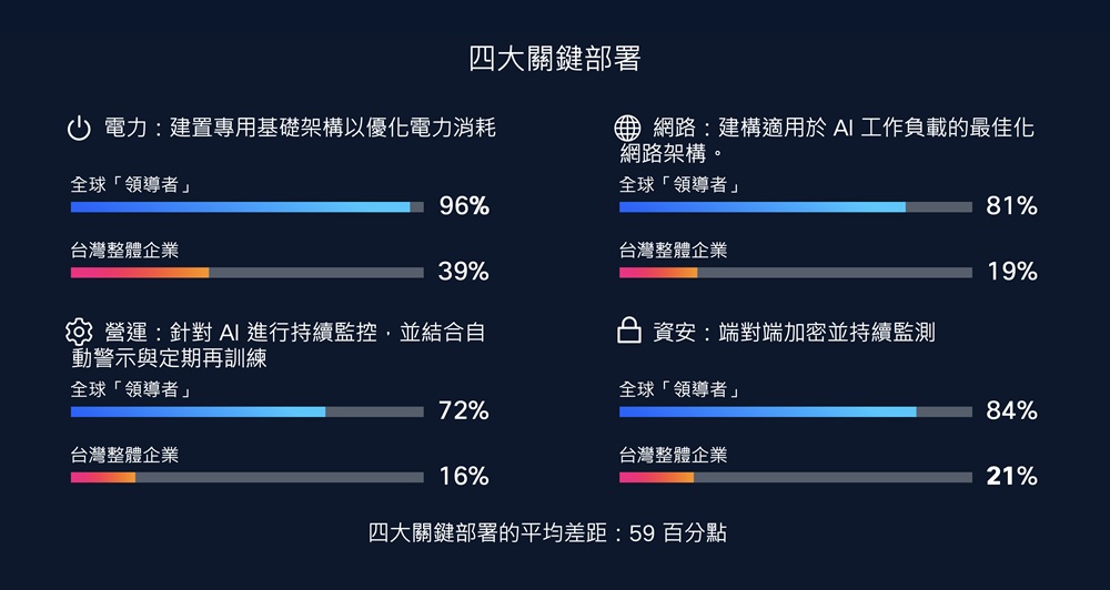一是「未雨綢繆,提前化解電力瓶頸」。全球96%的AI領導者已建置專用架構以優化電力消耗,而台灣僅39%企業具備同等能力,顯示AI運算擴張與電力基礎建設脫節的風險正在浮現。