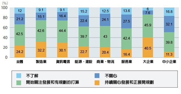 大多的產業新聞、或研究報告均相信,製造業將會是快速導入使用5G應用的產業之一。根據日本總務省的一份2020年情報通信白皮書數據顯示,事實上也似乎是如此。在此產業報告中,區分了日本製造業、資訊通信業、能源基礎建設、商業物流、服務業、大型企業和中小企業等七個族群,進行5G導入計畫的調查,並將受訪的回答區分為不了解、不關心、開始關注發展和有規劃的打算,以及持續關心發展和正展開規劃(圖1)。