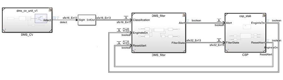 過濾元件以電腦視覺元件的輸出資料作為輸入。它追蹤「偵測到眼睛」和「閉眼」的訊號值,過濾掉短時間的眨眼,並且當訊號顯示駕駛者眼睛閉上的時間太長時透過AUTOSAR自適應啟動警訊,與EB AdaptiveCore軟體架構溝通。從頂層的Simulink模型產生了一個單元測試模型,可以執行系統驗證與評估設計是否符合ISO 26262。