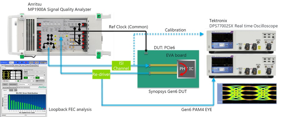 根據PCIe 6.0的基本規格,安立知MP1900A將產生由 DPO70000SX示波器校準的應力相容訊號,並將該訊號傳輸至Synopsys PCI Express 6.0 IP,即可使用待測物(DUT)內部錯誤計數器來測量位元錯誤。此外,MP1900A PAM4誤碼檢測器(Error Detector)可在待測物回放模式下,測量位元的誤差。使用MP1900A的FEC功能,將有助於分析並顯示FEC糾正與未糾正錯誤,以及後FEC誤碼率,而DPO70000SX即時示波器則可分析來自待測物的訊號波形。除了PCIe 6.0的基本測試之外,也可以進行PCIe 5.0鏈路等化(LEQ)的測試。