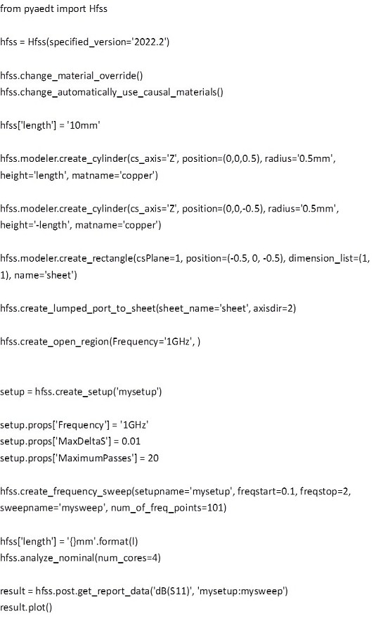 首先,程式碼使用指定的AEDT版本來建立一個Hfss物件。接著,設定材料和材料的特性。然後,建立一個長度為10毫米的圓柱體作為導體的天線。同時,在天線的兩端分別建立一個長度為10毫米的圓柱體,作為導體的延伸。