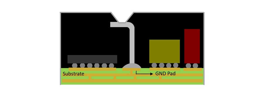 隨著SiP技術的不斷進步,傳統的金屬遮罩(Metal Can)焊接屏蔽方式,因其占用空間大、設計靈活性差,只適用於非模具(Non-Mold)產品等缺點,已逐漸被淘汰。環旭電子首創「Trenching & Filling epoxy 隔間屏蔽製程」突破這一限制,為SiP產品的發展提供有力支持。