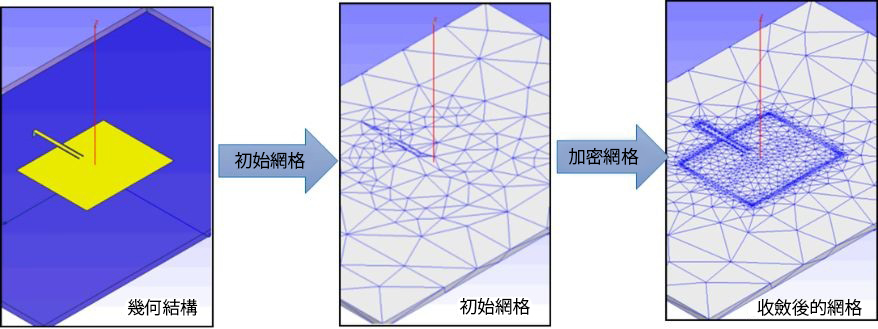 | 圖三 : HFSS自適應求解過程:自動生成初始網格,網格加密細化疊代,直到收斂。可以看到,對精度影響大的區域網格密度更高,不僅降低了軟體使用難度,還大大減少了求解所需的網格數量,提升內存和時間效率。目前為止,將自適應網格剖分作為求解默認選項並成熟應用於工程問題還是只有ANSYS電磁場工具 |