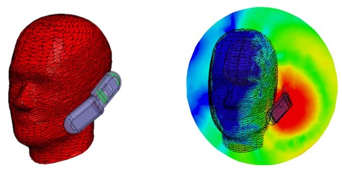 | 圖四 : HFSS求解手機天線與人體效應。直接求解器需要更多的內存,但求解精確度和穩定性更好。研發人員一直致力於改進有限元素直接矩陣求解器,從HFSS v12開始,推出改進後的疊代矩陣求解器,內存效率和求解強韌性顯著提升 |