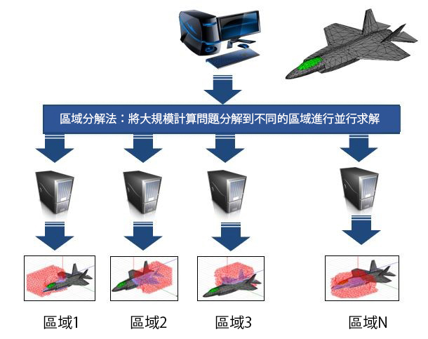 採用「分而治之」的方法,將大規模的電磁場有限元素問題劃分成若干區域,分別進行求解,透過在相鄰子區域之間設置適當的邊界條件,確保電磁場的連續性和求解結果的準確性。由於各個子區域可以在不同的電腦上進行平行求解,因而可以充分運用最新的平行運算技術,在大大提升求解效率同時,突破單一運算節點資源的限制,提高運算規模。