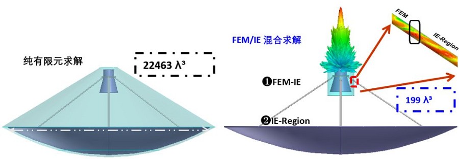 | 圖七 : 反射面天線的多演算法混合運算:複雜的天線饋電採用有限元素法,外圍的輻射邊界定義為FEBI (有限元素積分邊界條件),而反射面本身和金屬支撐結構則定義為IE區域,大大減少運算規模,同時,這些不同的區域在求解中會進行疊代,從而考慮他們之間的耦合遮擋等電磁效應 |