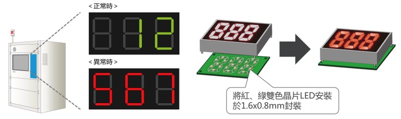 近年来,在工业用设备或消费电子产品的数字显示上,使用晶片LED的情形越来越多。传统上多使用单色,不过希??藉由改变颜色来确认异常状况的市场需求也逐渐升高。