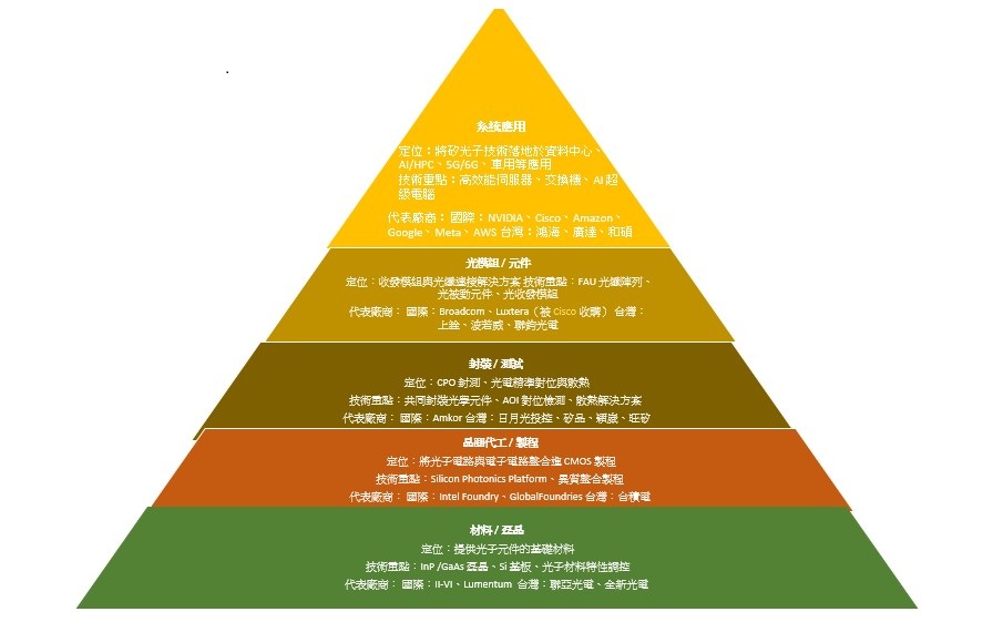 矽光子產業正快速成長,並推動全球供應鏈的重組。在這波技術演進中,台灣憑藉半導體代工、先進封裝與光學元件的完整布局,正逐步成為不可或缺的戰略樞紐。無論是晶圓製造、光電元件,還是系統整合,台灣都具備承接國際大單、並與科技巨頭深度合作的優勢。