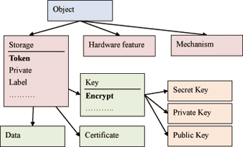 而在Slot的下面管理多種類型的物件,每個物件都包含了許多的屬性(Attribute),大致上可分為幾類:一、物件的辨識資料,如Label、ID、Subject等,用來與其他物件區分的辨識值;二、物件的儲存特性,如Token、Private,描述物件是否永久存在,是否公開使用,或是否受到保護不能匯出等;三、描述物件支援的操作(如Encrypt、Decrypt、Sign、Verify等);四、放置物件的值,可能是金鑰值或資料值(如Value、Modulus等)。物件可以整理成一個類別階層,子類別除了有自己專屬的屬性外,亦繼承父類別擁有的屬性。例如今天有一個Secret Key物件產生,這個物件則包含了其父類別Key與Storage的屬性,因此在Secret Key應包含Token、Encrypt等屬性。如圖二所示。