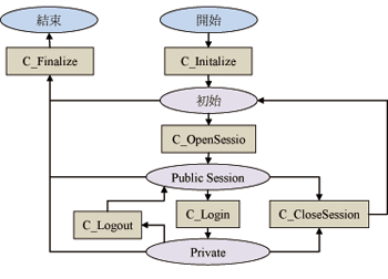 要使用Slot內的物件前,必須建立一個Session,使用C_OpenSession函式選擇一個Slot並開啟一個Session(會議期),才能夠進行進一步的物件操作或使用演算法。而C_OpenSession、C_CloseSession、C_Login、C_Logout、C_Initalize、C_Finalize為PKCS#11主要狀態循環的操作函式。C_Initalize、C_Finalize代表PKCS#11模組與加解密裝置的整體初始化與結束,提供模組或加解密裝置取得或清除系統資源的時機。當呼叫C_Initalize進行初始化,狀態就會進入「初始」的狀態,準備接受應用程式提出開啟交易的請求。而使用者呼叫C_OpenSession之後,狀態會進入「Public Session」的狀態,此時由於並沒有登入選定使用者模式,因此只能操作公用物件。假設使用者呼叫了C_Login,狀態則會進入Private Session,代表可以操作公有與私有物件。如果使用者想要更換登入的使用者模式,則可呼叫C_Logout讓狀態回復到Private Session的狀態,並且重複呼叫C_Login。若使用者使用完成或需切換到另外一個Slot時,則需呼叫C_CloseSession將狀態回覆到初始狀態。除此之外,PKCS#11定義了兩種使用者模式:SO與User,只有在C_Login時選擇User模式時,可以自由操作Slot內的物件,SO模式則是用來做初始化Slot等系統管理功能。