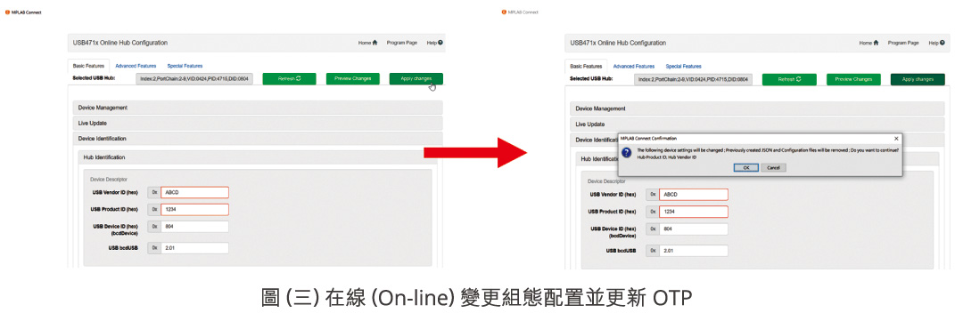 至於在線(On-line)執行,請讀者自行參考離線執行。只需要把“Offline(Device Detached)”改成選“Online(Device Attached)”,就可以進入組態編輯頁面。我們的重點是在線變更組態配置並更新OTP。同樣以更改VID 及PID為例,在“Basic Features”功能頁面點選“Device Identification”,並點選“Hub Identification”將VID和PID變更後,再點選Apply changes。最後再對彈出的訊息框點選“OK”,USB4715將重新被GUI枚舉,您可以看到VID 及PID已經改變成剛剛要更改的值。讀者可以參考圖3所示。