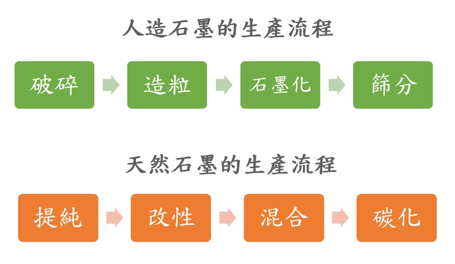 | 圖一 : 人造石墨與天然石墨的生產流程(source:作者自行繪製) |