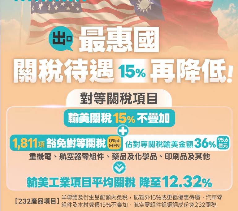 雖然台美《對等貿易協定》(ART)最終趕在農曆年假前的2月12日完成簽署,達成了平均關稅12.33%、最高關稅15%且不疊加。半導體等資通訊企業赴美設廠及營運所需原料、設備、零組件等多項關鍵產品零關稅;另有2,072項產品,包含:農產品261項、工業產品1,811項等,取得豁免對等關稅及232條款關稅的成果,約占對等關稅輸美金額比重36%、達95.6億美元,使輸美工業項目平均關稅降至12.32%。