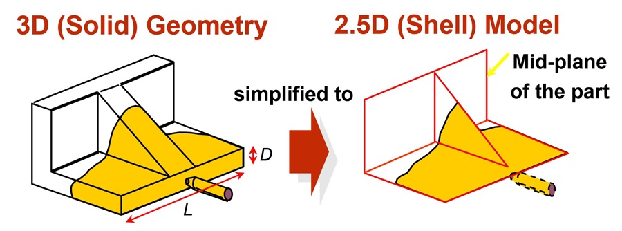 Shell模組是一種在有限元分析中常用的方法,其簡化模型的方式是忽略了厚度這一維度,3D模型改變為2.5D的幾何形狀,可以節省計算資源,並易於進行設計變更修改,因為不需要在厚度方向上建立大量的網格元素,也就能在不需要極高計算資源的情況下即可完成模擬分析。這種簡化特別適合對於厚度和長度差異較大的薄殼結構或零件進行模擬分析。