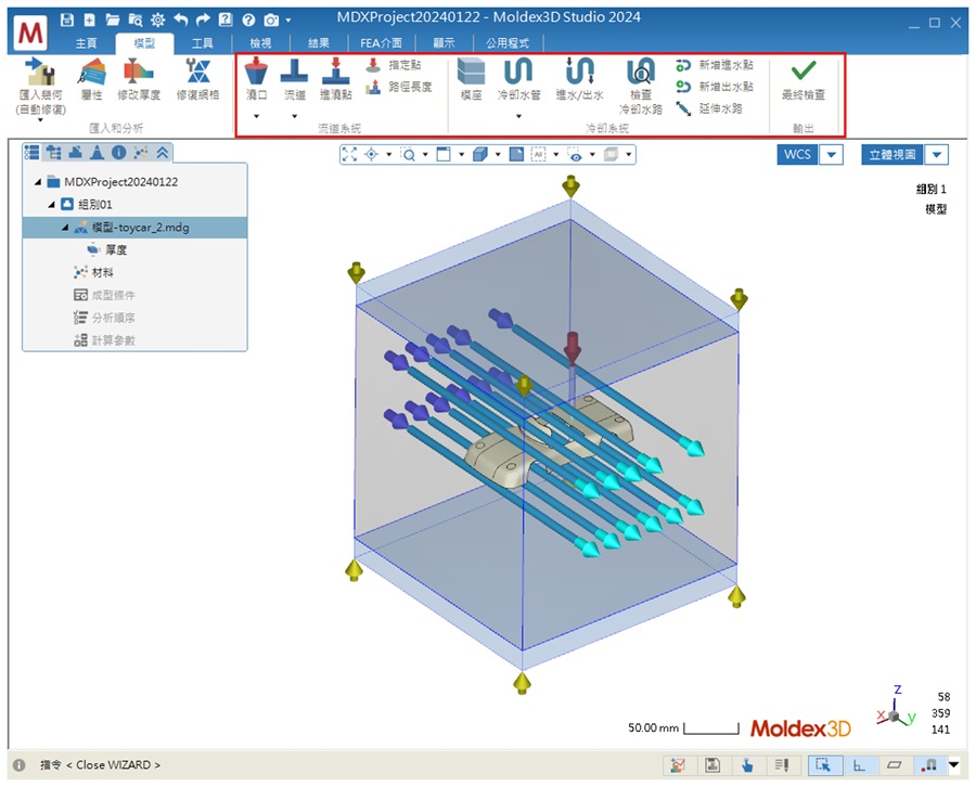 至模型頁設定澆口後,選擇流道就自動產生流道,後續設定模座、冷卻水路皆為預設值,此時點選最終檢查的綠色勾,確認完成網格前處理。