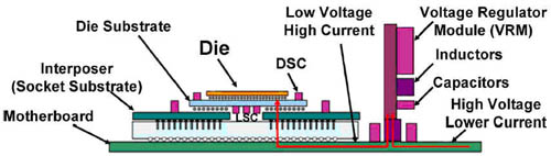 即使是3 維整合(3D integration),也有人稱之為垂直整合(Vertical System Integration; VSI)。或者稱之為方塊 「Cube」。 圖 1是IMEC 的 System in a Cube 概念,從圖上,我們可以看到在各個電路(看來像是PC 載版)的夾層中間,還可以提供 「側面」的銲錫隆點(solder bump)。因此,似乎在這個系統的前後左右還可以繼續「併接」相關電路。這種概念的確很新穎。如圖2,為一個水平封裝系統與垂直封裝系統的結合的實際電路圖,右邊垂直的電路是用來提供左邊電路所需要的電源,因此,其包含了電壓調整模組(Voltage Regulator Module; VRM),電感 (inductor),與電容(capacitor)。輸入為一個高壓低電流的訊號,輸出給左邊電路則是低壓高電流的訊號。這樣看來更像是一種3D 整合。