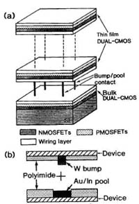 這是 2006 年,NEC 用此種SMAFTI 技術在影像處理系統所用的邏輯和記憶體晶片之間,建立起超過1,000個以上的三維互連。這其實是一種晶圓級封裝技術,它使用7um厚的聚醯亞胺樹酯(Polymide Resin)介電層和15um寬的銅互連,來建構對中介層的佈線路徑,因而產生間距為50um的縱向互連,能夠支援高達100Gbps的傳輸速率,並且可以降低功耗,高階手機、視訊遊戲或數位電視等應用。