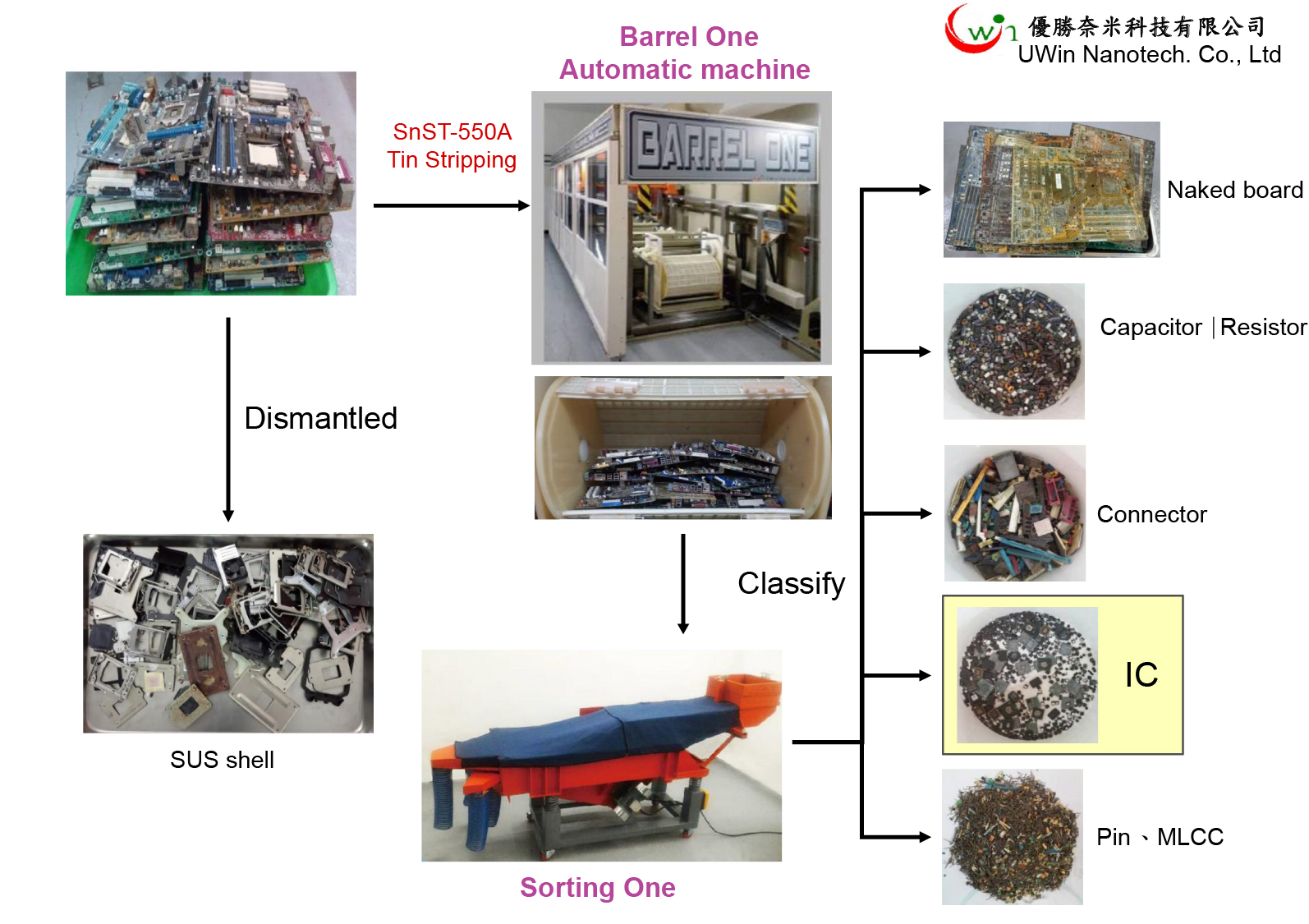 @內文:針對正快速成長的雲端伺服器的貴金屬回收需求,優勝奈米也已進行了一系列的分析與實驗,並開發出一套自動化的回收流程與設備。依據優勝奈米的流程,伺服器中的廢主機板會先進行拆解與「剝錫(Tin Stripping)」,而其剝錫的流程採用自動化的機台,透過環保剝錫劑(SnST-550A)來過迅速將其上的鍍錫剝除並回收。