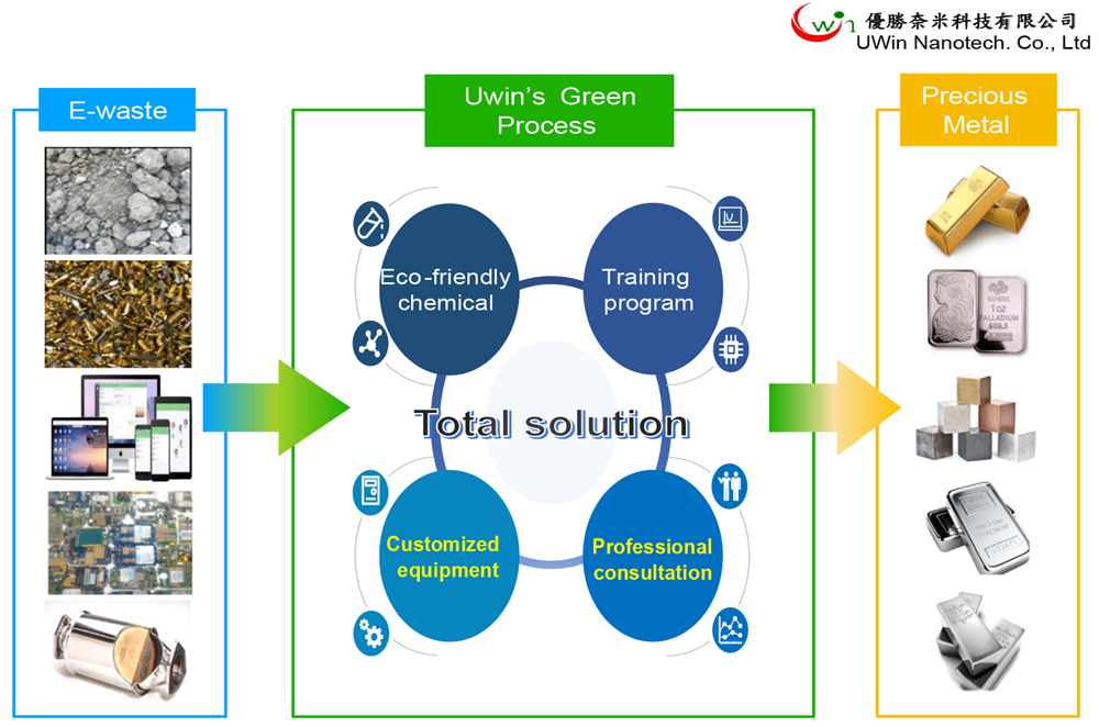 台灣的優勝奈米科技(UWin Nanotech)便是一家專門提供濕式環保貴金屬回收解決方案的業者,透過其無毒、無汙染的剝金方案,能在不傷害人體與環境的前提下,快速且高效益的完成電子廢棄物中的貴金屬回收。