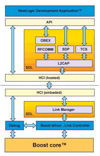 堆疊以HCI介面劃分。低層基頻部分採硬體建構(基頻IC或藍芽晶片組的一部份,也被稱為「host控制器」)。上半部則以軟體在host上建構,因此被稱為「hosted」,範例如Newlogic的Boost(圖四)。「通訊協定堆疊」經常指的是上層堆疊。(註二)