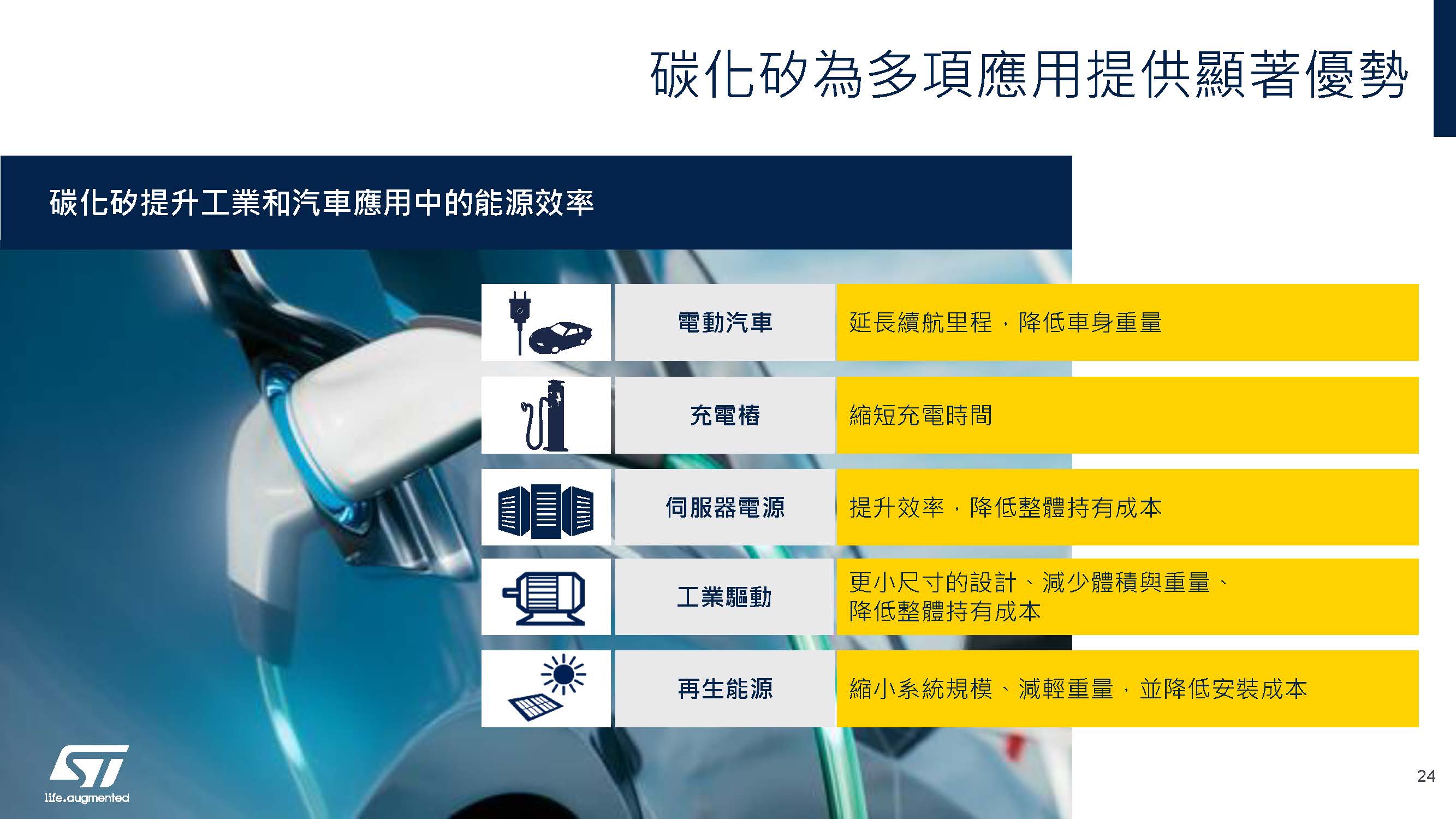 Pignataro最後強調,隨著碳化矽技術的規模經濟效益不斷擴大,製程愈加競爭力,成本結構接近傳統技術,這使得碳化矽有望在各個領域,從電動車到能源、航空等行業,發揮更大的作用。STMicroelectronics將繼續致力於擴展碳化矽的應用,並在這一技術革命中處於領先地位,迎接未來更加電動化、可持續的世界。