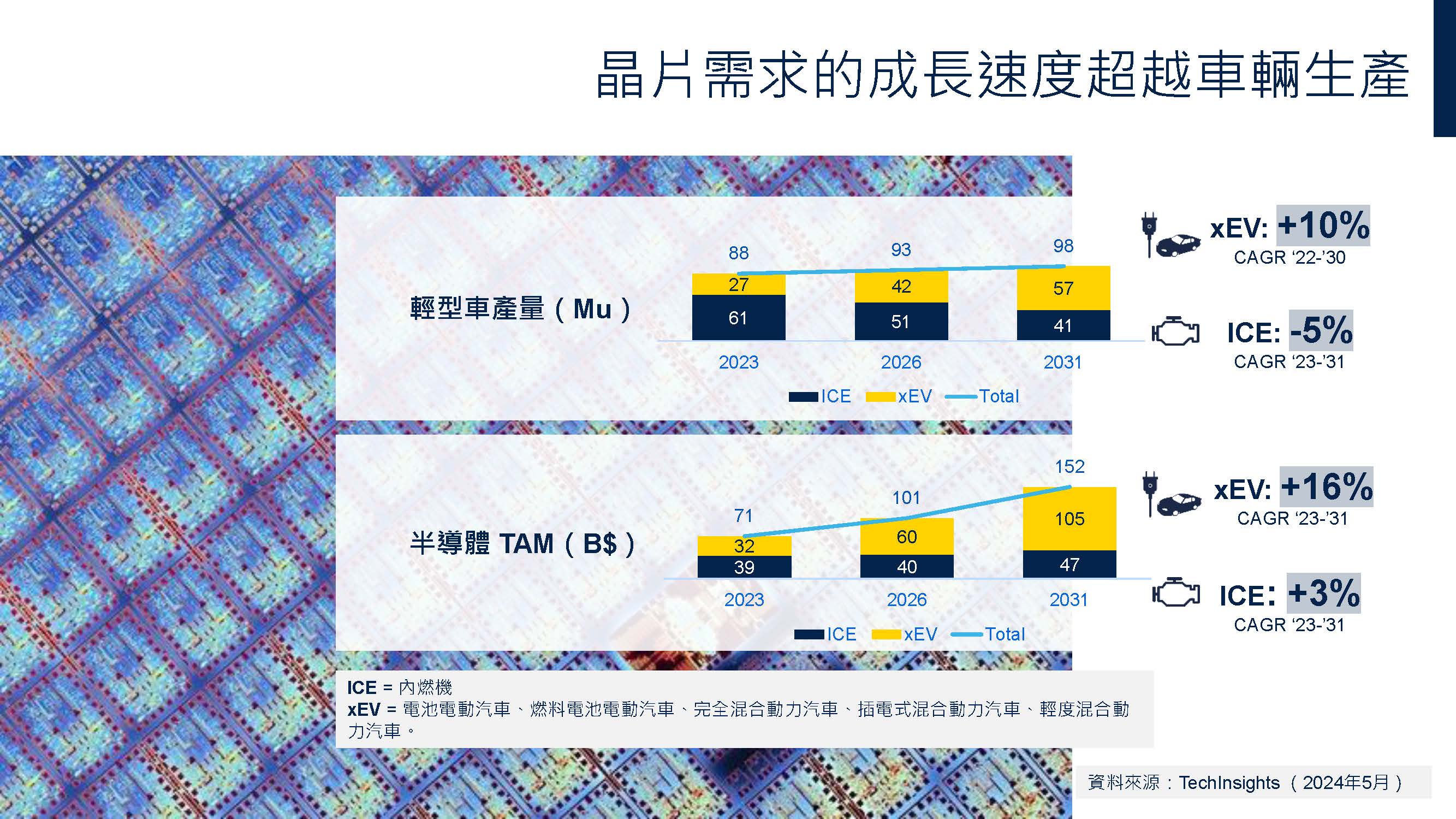Pignataro強調,汽車市場無疑是碳化矽最大的成長機會。儘管電動車和油電混合車(xEV)在全球輕型車產量中仍佔比較低,但其市佔率正在穩定增長。隨著電動車成本逐漸接近傳統燃油車,消費者對環保選擇的接受度提高,這也促使半導體在車輛中的需求快速增加,為ST等企業創造了龐大的機會。