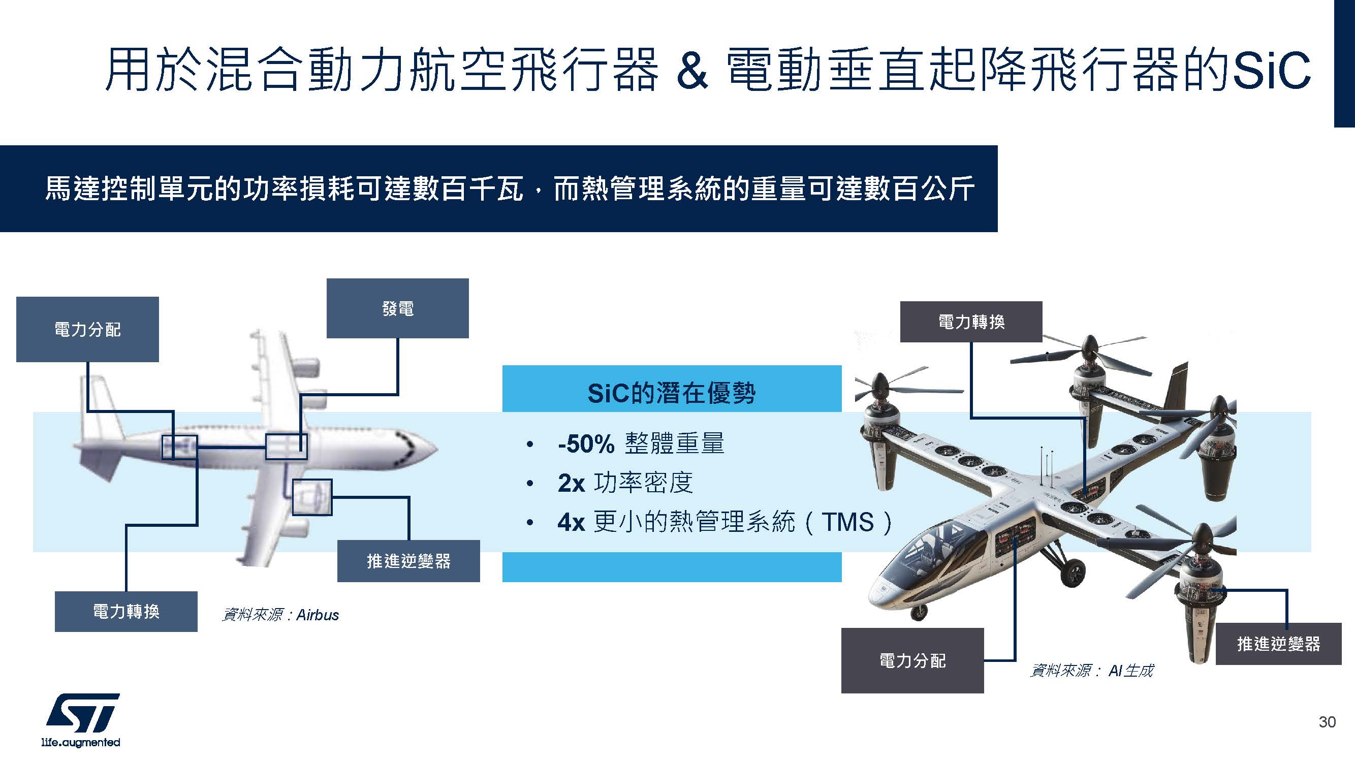 Pignataro也談到,除了汽車外,碳化矽在航空領域也顯示出巨大的潛力。混合動力飛行器和電動垂直起降飛行器(eVTOL)等特殊應用也開始受益於碳化矽的高效能。碳化矽能夠顯著減輕系統重量,對這些應用來說至關重要。根據與空中巴士等合作夥伴的估算,碳化矽可以減輕電子系統的重量達50%,同時提升功率密度。由於碳化矽在更高溫度下運作效率更佳,這也有助於減少對大型冷卻系統的需求,簡化熱管理並提升整體系統的效能。