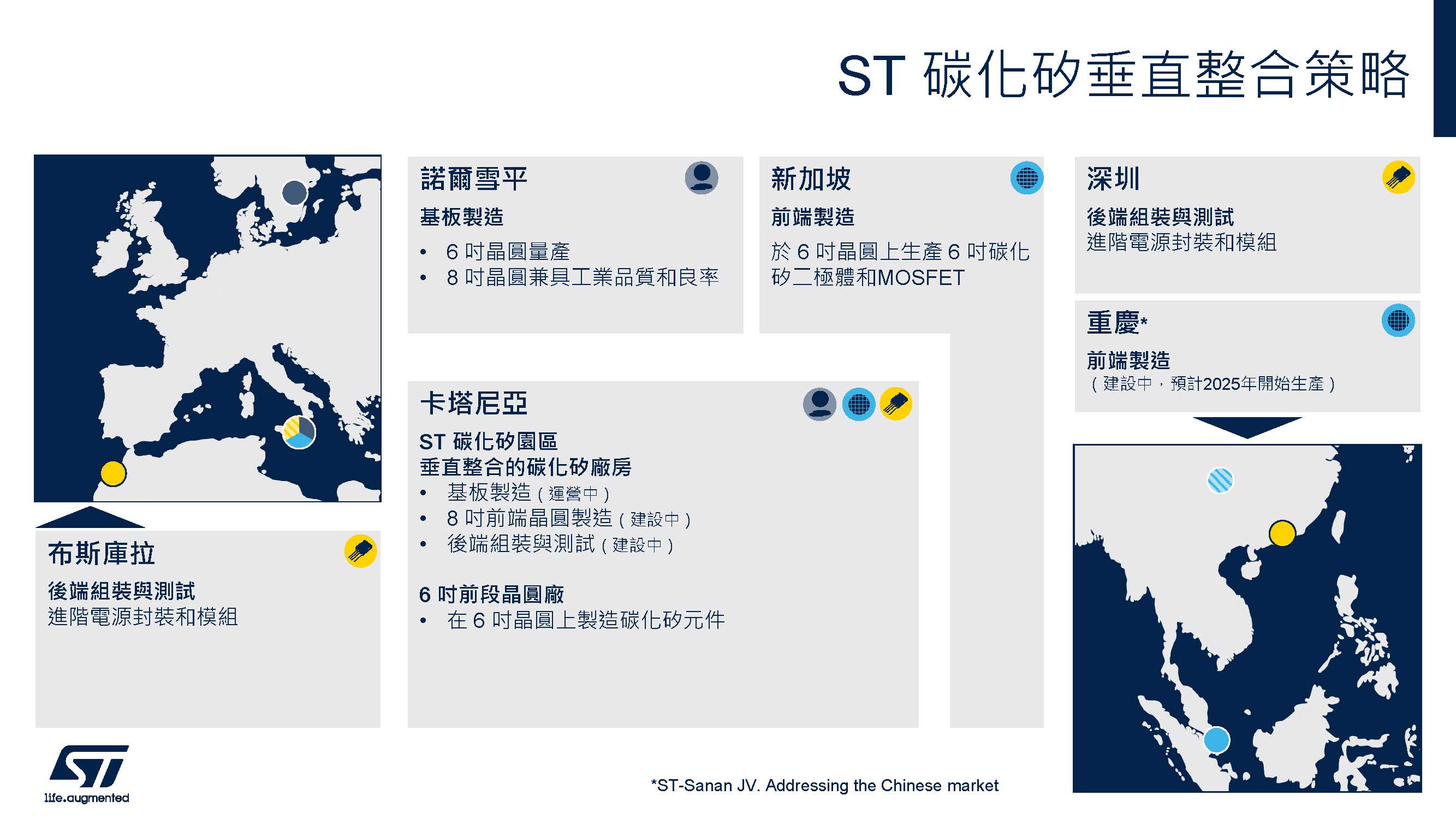 此外,ST也持續投資擴充生產規模,並在全球範圍內設立了多個製造據點,確保產能能夠滿足日益增長的市場需求。Pignataro透露,ST目前正在積極投入8吋晶圓的量產,並已完成卡塔尼亞的首條8吋試產線認證,目標是全面投入8吋晶圓的量產。