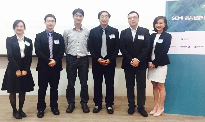 圖一 :  SEMI雷射國際論壇由半導體產業指標性專家分享雷射技術未來發展趨勢。由左至右依序為SEMI台灣區副理林惠姿、迪思科高科技(DISCO)雷射技術應用部主任工程師陳冠宏、矽品精密工業研發暨工程中心製程技術研究部部經理陳培領、欣興電子執行長室 / 新事業開發副部長簡俊賢、鈦昇科技行銷處長林傑倫、SEMI台灣區總監李敏華