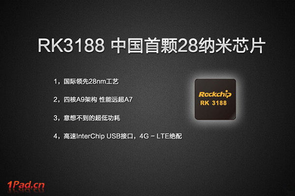 RK3188除了内建高效能2D加速硬件,并配备High-Speed Inter Chip高速通信端口,支持超高画质分辨率,未来还能支持Android4.2及更高版本。除了大幅提升效能之外,凭借着28nm制程技术也获得更低的功耗。RK3188使用了HKMG(高介电常数金属闸极)技术,能够在防漏电方面表现更为出色。