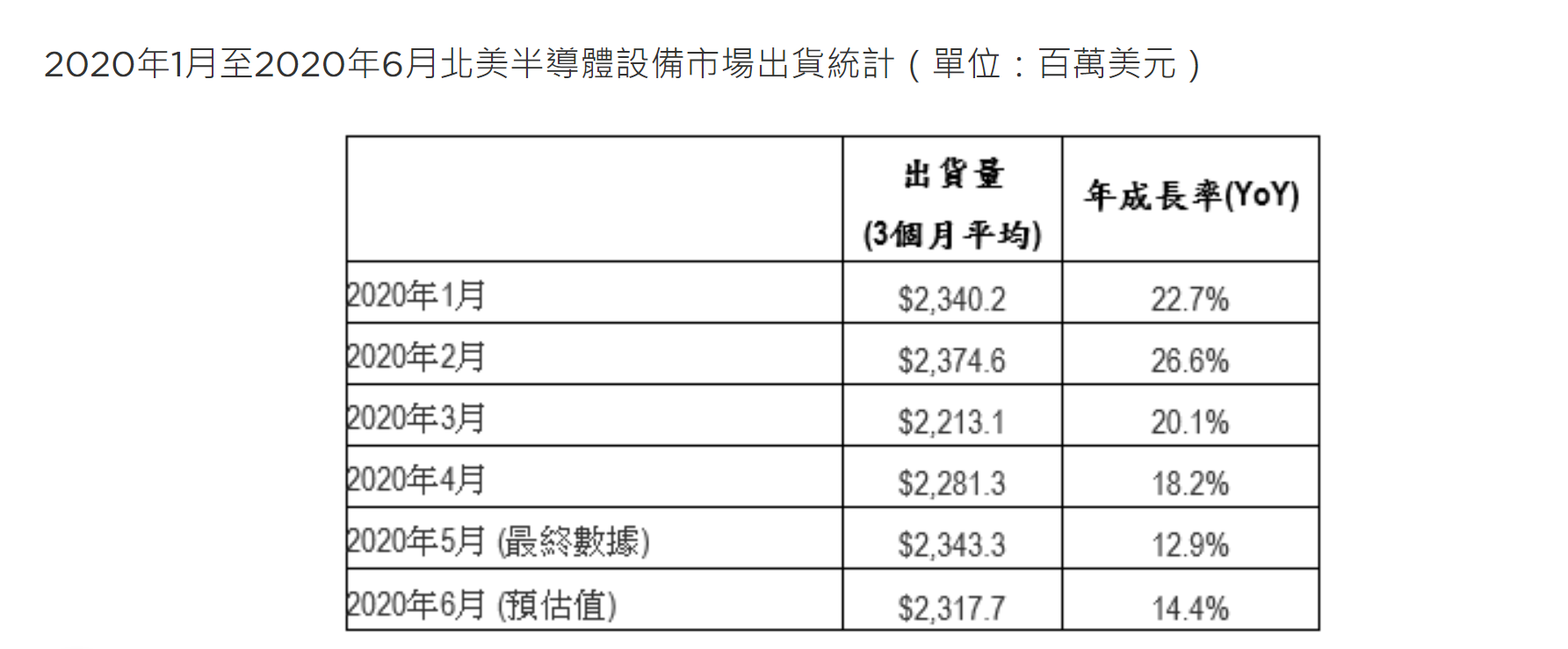 SEMI所公布之Billing Report乃根据北美半导体设备制造商过去三个月的平均全球出货金额之数值。
