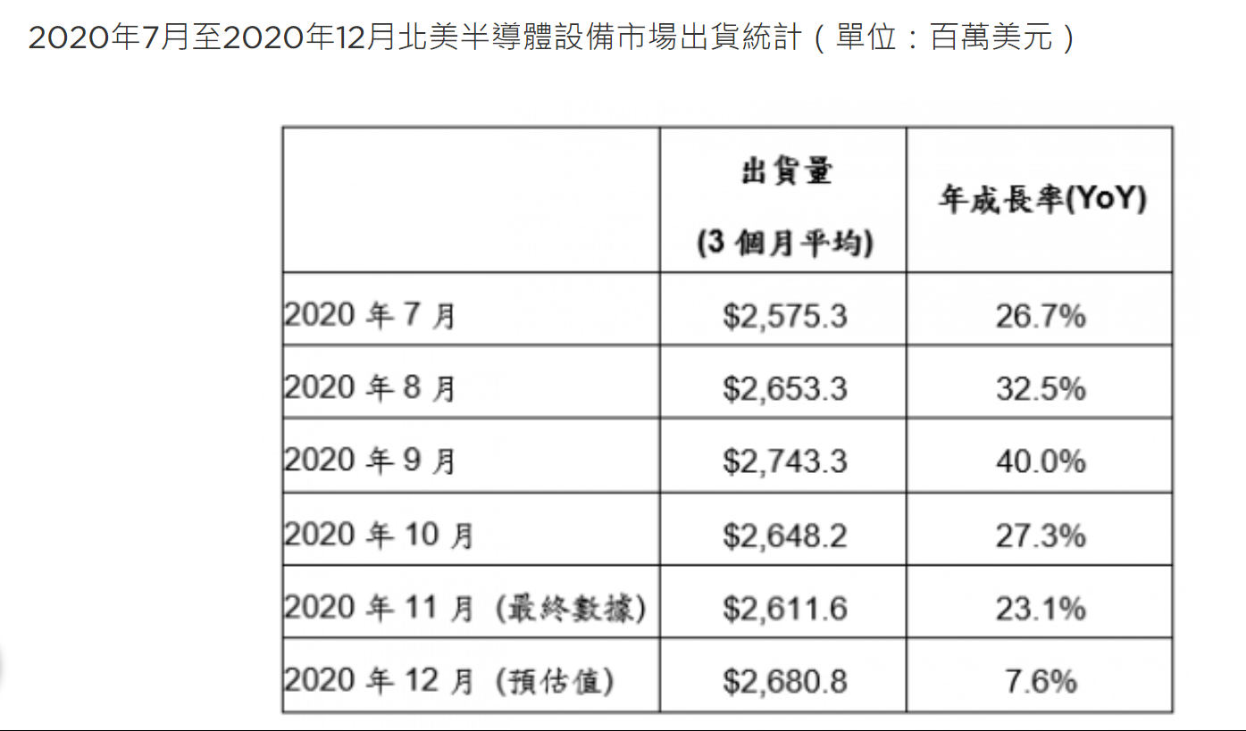 | 2020年北美半导体设备年度出货金额超越2018年,创下产业新高。 |