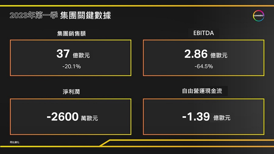 科思创2023财年开局超出预期,尽管商业环境仍充满挑战,需求依然疲软,但科思创成功制约了相关负面因素的影响。2023年第一季度,主要受销量和销售价格下滑影响,集团销售额与去年同期下降20.1%至37亿欧元(去年同期:47亿欧元)。