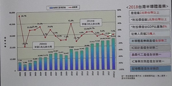 工研院最新預估,2018年台灣IC產業產值達新台幣26,343億元,較2017年成長7.0%。其中IC設計業產值為新台幣6,403億元;IC製造業為新台幣15,000億元,其中晶圓代工為新台幣12,894億元,記憶體與其他製造為新台幣2,106億元 (受惠全球記憶體價格持續成長力道);IC封裝業為新台幣3,465億元;IC測試業為新台幣1,475億元。