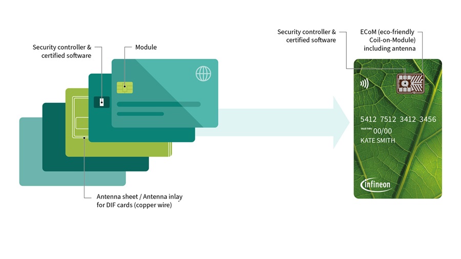 傳統支付卡需要在卡片上嵌入獨立的銅線天線,並使用包括鑲嵌箔在內的各種材料層。這些材料層和覆蓋了整張卡片的銅線天線,使得傳統非接觸式支付卡幾乎無法被輕鬆回收。英飛凌全新SECORA Pay Green解決方案則採用新型環保線圈模組(eCoM)封裝,包含安全晶片和各種軟體元件,並整合非接觸式天線,提升雙介面支付卡的回收利用標準。在卡片報廢時,可將整個eCoM封裝從卡片移除,作為電子廢棄物處理,而具備同質性的卡體可根據其塑膠、木材或紙張等不同材質進行回收利用。整合式天線還減少了與運輸和採購相關的成本與排放。
