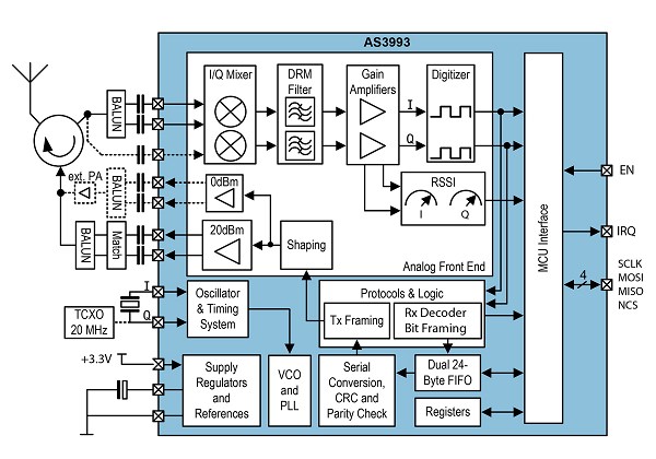 1153的开发团队在初步设计阶段所面临的瓶颈来自性能、尺寸和功耗三方面的制约。 Technology Solutions选用的AS3993来自奥地利微电子,采用紧凑的7mm × 7mm QFN48封装。该元件的运行电压可低至2.7V,并能相容1153读取器中的1,130mAh锂聚合电池。在正常运作模式下,AS3993只需65mA的电流。