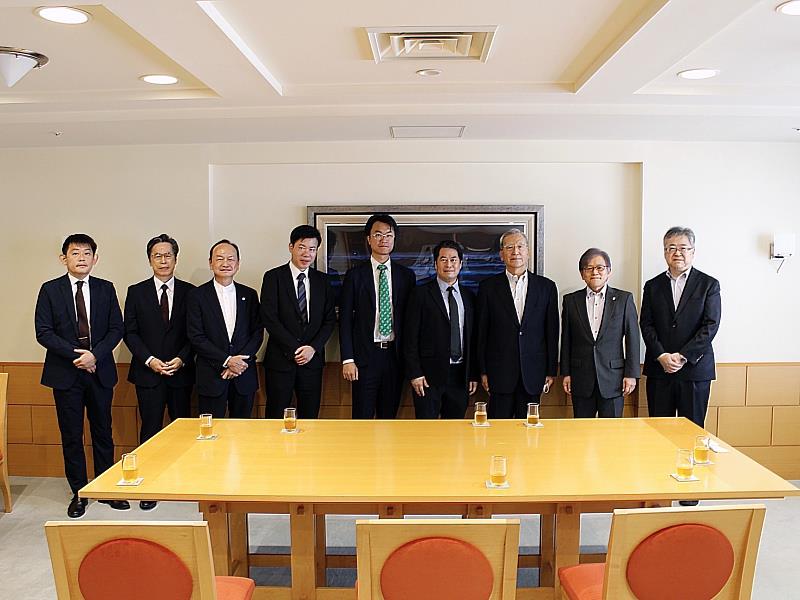 | 中信科大校长郑钦哲(右四)、中信金融管理学院教务长蔡惟钧(右五)与西日本工业大学校长鹤田隆治(右二)和理事长鹿田磨树(右三)合影。(中信科技大学提供) |