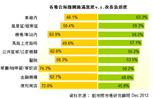 根据创市际的市调结果发现,使用无线网络的民众,几乎对各场合使用无线上网的需求都很高,尤其是在「餐厅/咖啡馆/快餐店」、「机场/车站内」、「便利商店」、「公共区域/公家机关」、「车厢内」及「风景区/游乐区」,可见无线网络对于现代人生活的重要性,虽然民众对于无线上网有相当大的需求,但全体民众对无线上网的满意度平均只有59.8%,若以满分100分须60分才及格的标准下,目前无线上网的满意度还不及格。