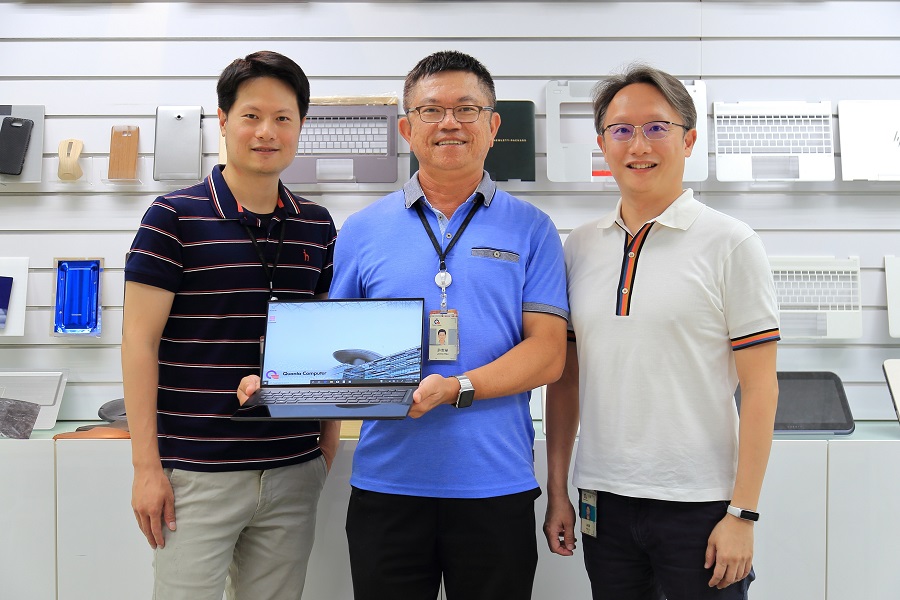 | 广达首推结合金属机壳5G多天线系统应用於窄边框笔记型电脑。图左至右为研发中心资深经理林军毅,??总经理许家荣,??处长林晖。 |