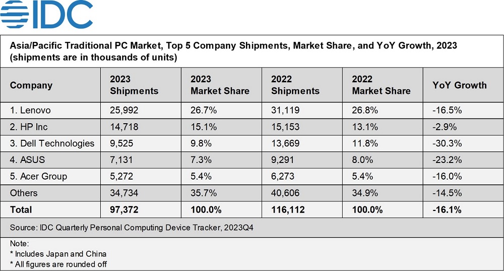 根据IDC最新「全球个人运算装置季度追踪报告」研究显示,亚太地区(包括日本和中国)的传统 PC 市场(桌上型电脑、笔记型电脑和工作站)2023 年出货量衰退 16.1%,至 9,740 万台。由於需求疲软和经济复苏缓慢,预计2024年出货量不会大幅反弹。