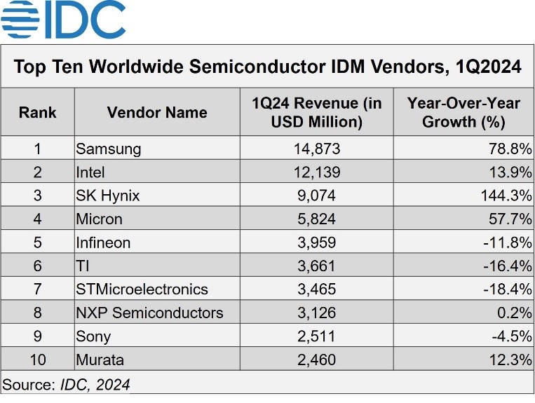 IDC最新研究「全球半导体整合元件制造市场:2024第一季前十大业者排名与分析」透露了2024 年第一季半导体产业的重要趋势。2024年在疫情影响逐步趋缓下,终端市场回稳,加上资料中心对人工智慧训练与推论的需求带动记忆体提升,整体应用及库存水准皆开始正常化,连带带动2024第一季整合元件制造(IDM)市场的发展,而其中高频宽记忆体(HBM)扮演重要角色。