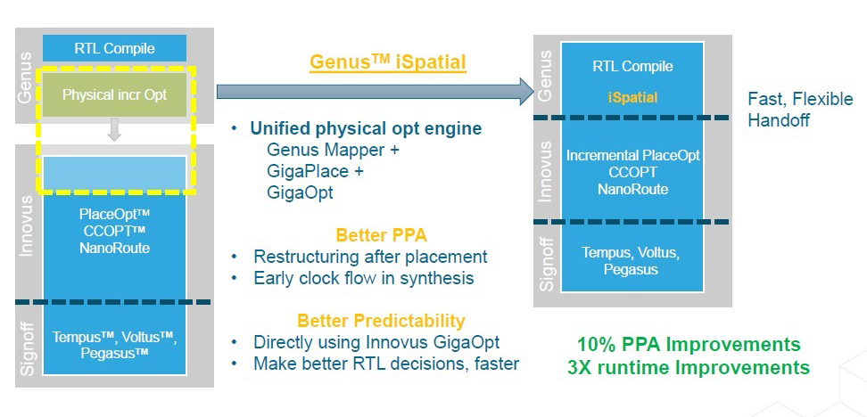 此外,藉由通用的使用者介面及資料庫,iSpatial技術也實現了Genus物理合成,到Innovus設計實現的無縫接軌,提供兩端的彼此切換(Handoff)的功能,帶來了更快速的IC開發速度,同時也有更多的設計彈性,以因應目前的晶片設計需求。