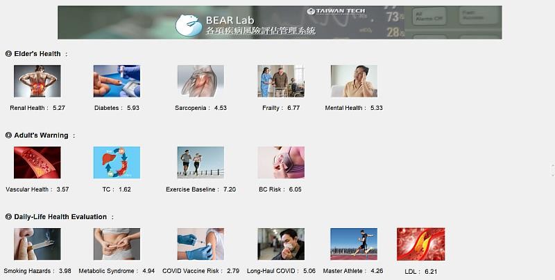 | 圖一為臺科大醫學工程研究所教授許昕(右一)與研究團隊合影。圖二為線上風險評估管理系統結合穿戴裝置即時產出圖形化報表,以指數評估不同狀態,協助快速掌握風險重點,精準對應後續治療。 |