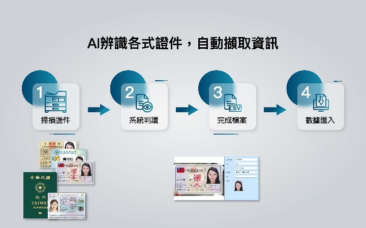 震旦「智慧證件辨識」可精準擷取各式證件資訊,助力旅宿業及大型園區優化管理流程。而AI智慧解決方案以「掃描文件—系統判讀—完成檔案—數據匯入」流程協助企業加速資料化與作業效率提升。