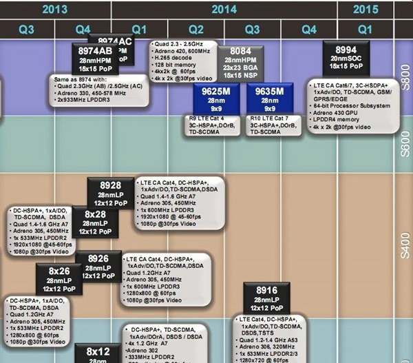 除了搶攻中階智慧手機64位元市場之外,高通同樣不忘布局旗艦級智慧手機64位元行動處理器晶片之路。根據昨日網路上揭露的高通產品Roadmap圖片資料顯示,型號為MSM8994 64位元行動處理器晶片將會被定位在旗艦級產品的最高位階,除了採用20nm製程技術,並搭配自家Adreno 430 GPU,更支援LPDDR4記憶體與4K視訊影片拍攝,預計最快將在2014年第四季或是2015年第一季才可能正式推出。