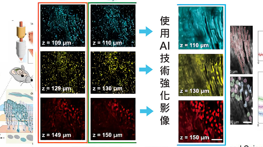 然而,高速影像的對比度仍然不足。為解決此問題,團隊導入AI技術,透過深度學習演算法,在無需基礎實據(ground truth)的情況下,以單雙張影像互相比對的方式,有效提升影像對比度達10倍,大幅提升影像品質,使觀察腦神經細節更加清晰。