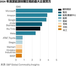 根據標普全球大宗商品的資料,資料中心在2024年的清潔能源採購中領先,主要通過直接購電協議達成超過17GW 的交易。製造業以 9GW 的清潔能源採購量位居第二,其後是服務業,採購量為 6GW。
